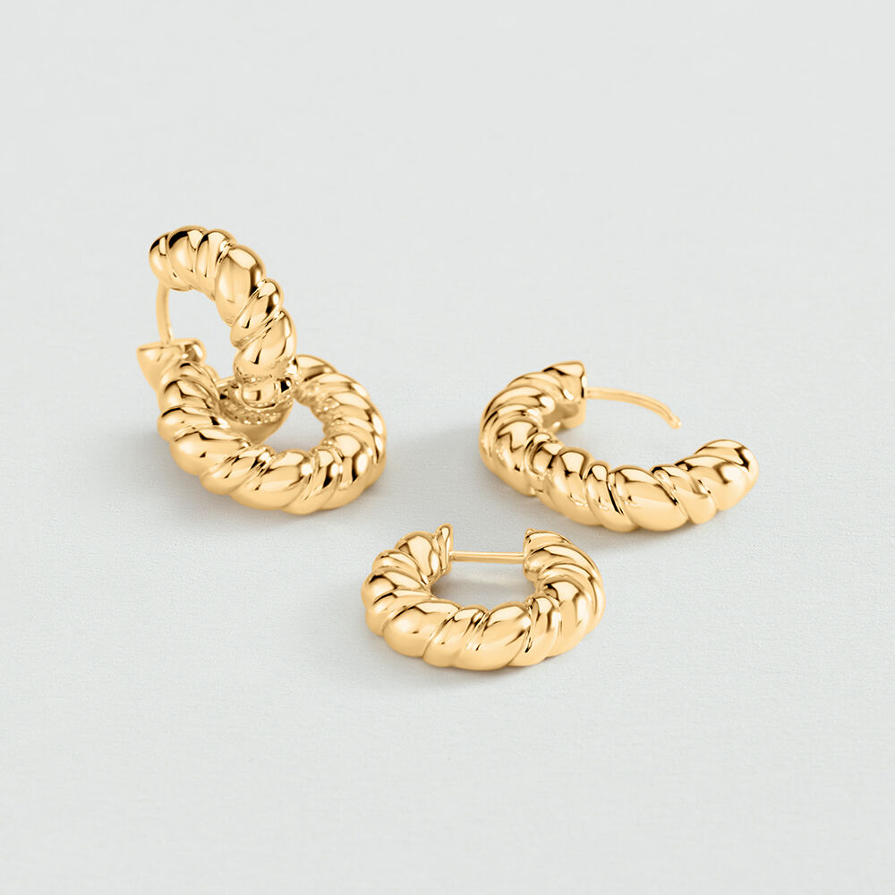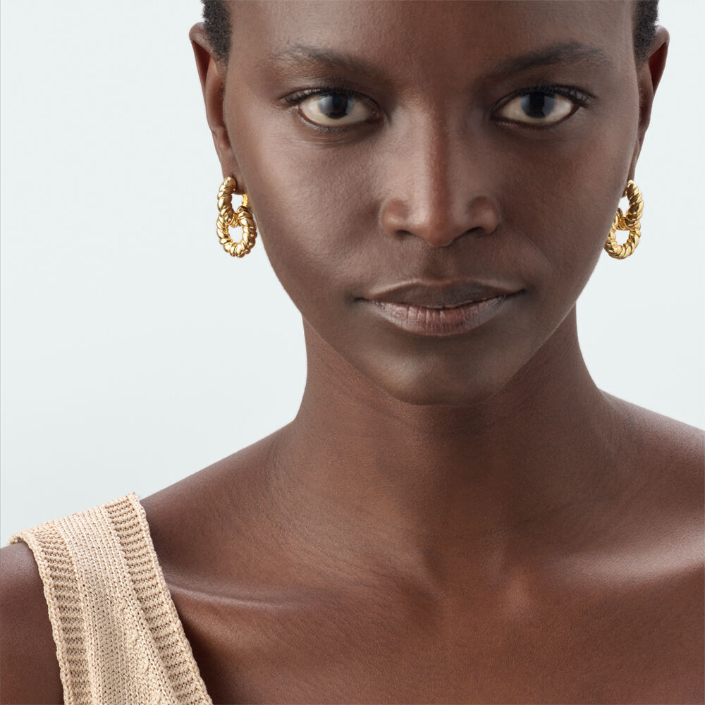 Doble criolla texturizada y acabada en oro. Al estar entrelazadas, ¡tienes dos pendientes en uno! Decide cómo y cuándo llevar tu complemento y sorprende cada día con un look distinto.