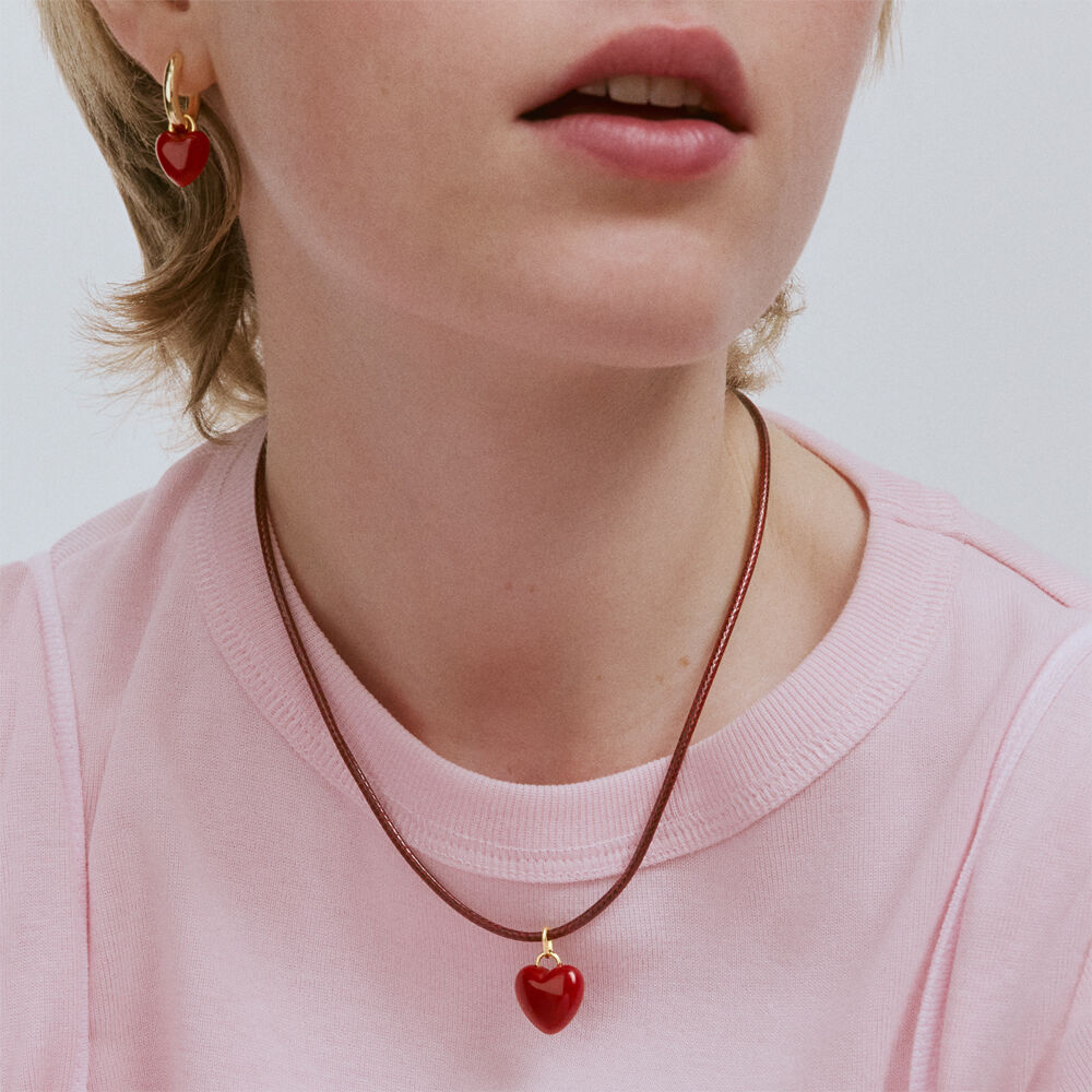 Criollas acabadas en oro con colgante de corazón en resina. Las tienes tanto en rojo como en blanco roto y son perfectas para el día a día. Los corazones son tendencia absoluta y estas criollas te salvarán cualquier look.