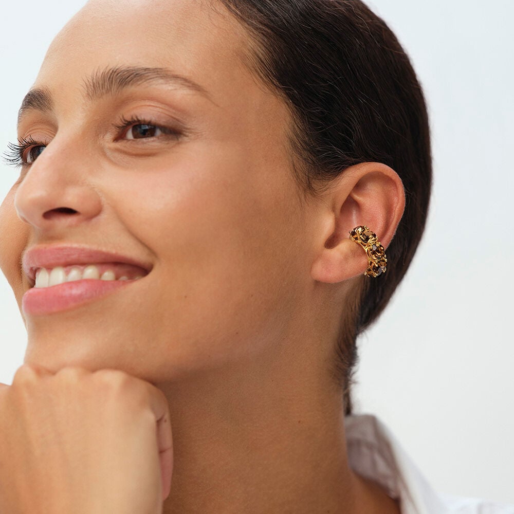 Ear cuff acabado en oro con circonitas marrones. El color de moda llega para decorar tus orejas y que te veas 100% favorecida todo el tiempo. El diseño es arrebatador y dará un twist definitivo a todos tus looks.
