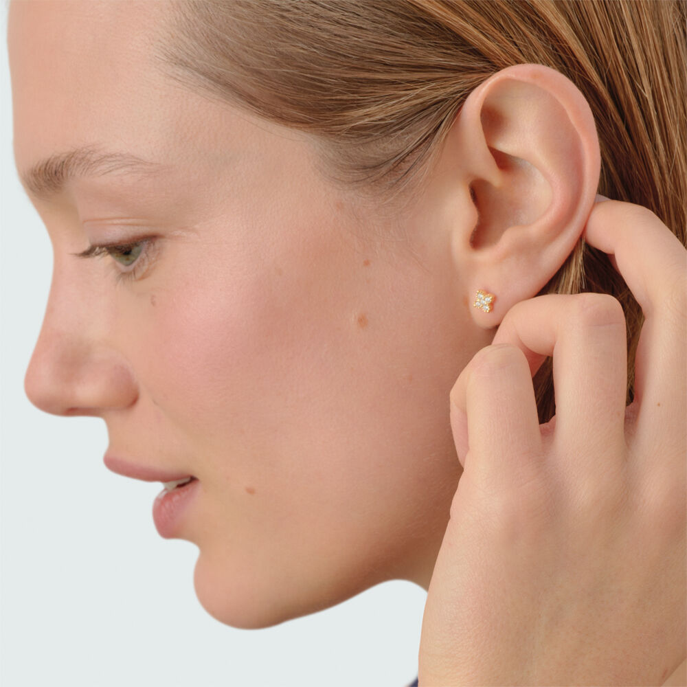 Pendientes de botón de plata de ley y baño de oro con una flor de circonitas. Un best seller de la marca que no te querrás quitar. Son el regalo perfecto si quieres acertar seguro.