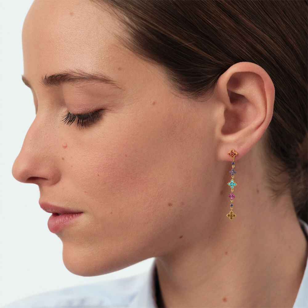 Pendientes largos de plata de ley acabados en oro con circonitas de colores. Una joya intemporal para lucir toda la temporada y dar el toque ideal de luz y brillo. Beloved es una colección perfecta para regalar y auto regalarse.