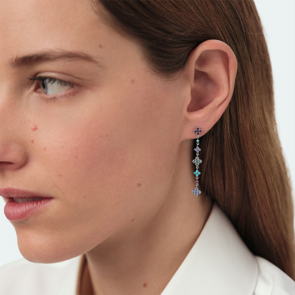 Pendientes largos de plata de ley con circonitas en tonos azules. Una joya intemporal para lucir toda la temporada y dar el toque ideal de luz y brillo. Beloved es una colección perfecta para regalar y auto regalarse.