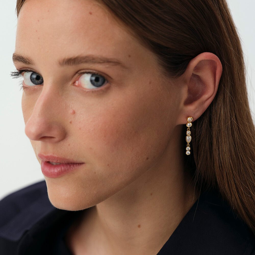 Pendientes largos acabados en oro con circonitas de formas diferentes. Un diseño original, desparejado, con el que sorprender y divertirte creando lookazos. Favorecen a más no poder y aportan un brillo muy especial a tus outfits tanto de diario como a los más especiales.