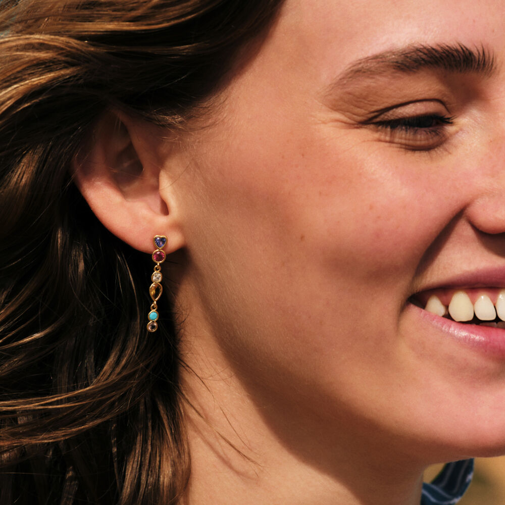 Pendientes largos acabados en oro con circonitas de formas diferentes. Un diseño original, desparejado, con el que sorprender y divertirte creando lookazos. Favorecen a más no poder y aportan un brillo muy especial a tus outfits tanto de diario como a los más especiales.