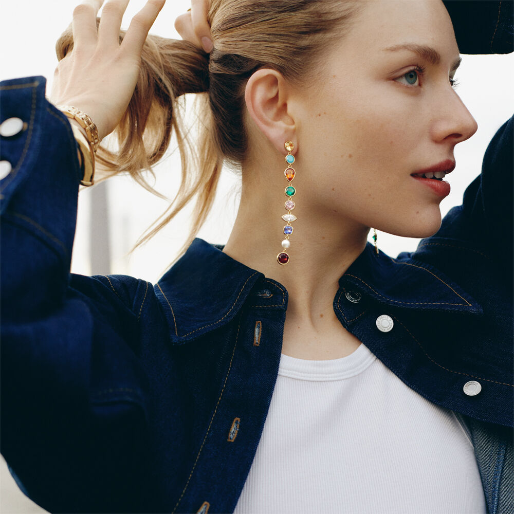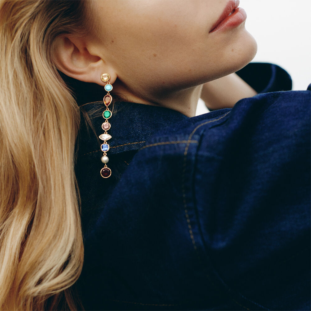 Pendientes largos acabados en oro con circonitas de diferentes formas y colores. Una propuesta ideal si lo que necesitas es aportar algo de luz y color a un outfit más neutro. ¡Atraparás todas las miradas!.