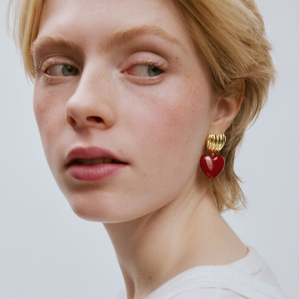 Pendientes largos acabados en oro con doble corazón: arriba dorado y texturizado y abajo de resina en color rojo o blanco roto. El aire chic afrancesado está asegurado con este diseño que no te quirrás quitar. ¡Candidatos a ser nuestros favoritos!