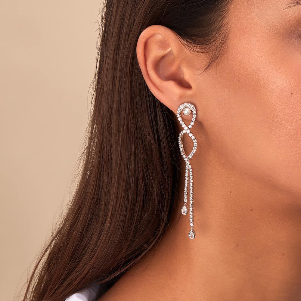 Pendiente largo con cadenas de circonitas cruzadas & perla.
