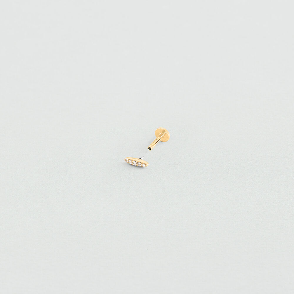 Piercing ovalado de plata de ley y baño de oro con circonitas en color cristal. El cierre es de rosca y está hecho en acero para garantizar su durabilidad. Este modelo es perfecto para hélix y tragus. Se vende a la unidad.