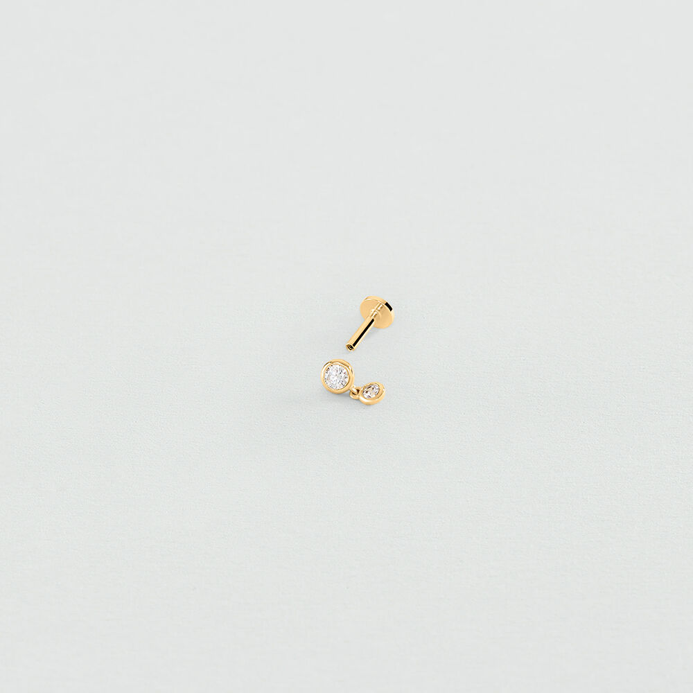 Piercing de plata de ley y baño de oro con 2 circonitas en color cristal, una de ellas que cuelga. El cierre es de rosca y está hecho en acero para garantizar su durabilidad. Este modelo es perfecto para hélix y tragus. Se vende a la unidad.