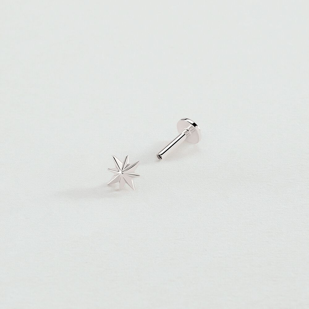 Piercing en forma de estrella. Es de plata de ley con baño de rodio y se vende a la unidad. El cierre es de rosca y está hecho en acero para garantizar su durabilidad..