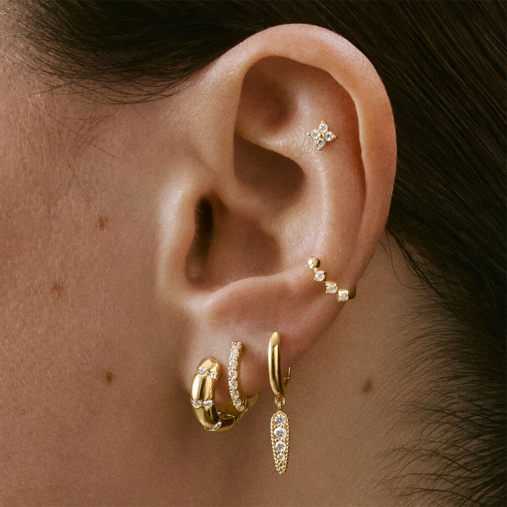 Piercing de plata de ley y baño de oro en forma de flor con circonitas en color cristal. El cierre es de rosca y está hecho en acero para garantizar su durabilidad. Este modelo es perfecto para hélix y tragus. Se vende a la unidad.