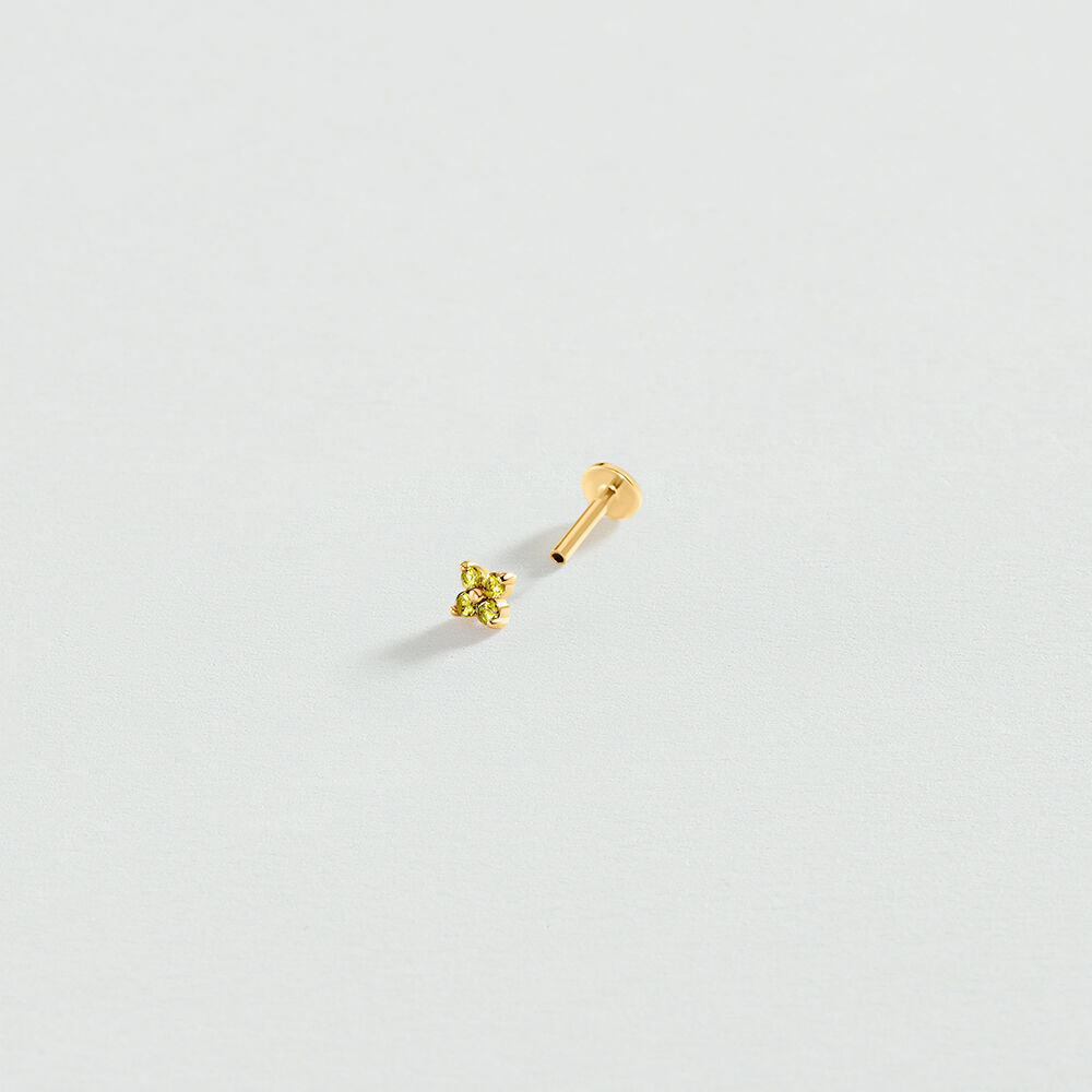 Piercing de plata de ley y baño de oro en forma de flor con circonitas verdes o rosas, tú decides. Ideal para aportar color a tus días. Nuestros Mix & Match se venden a la unidad.