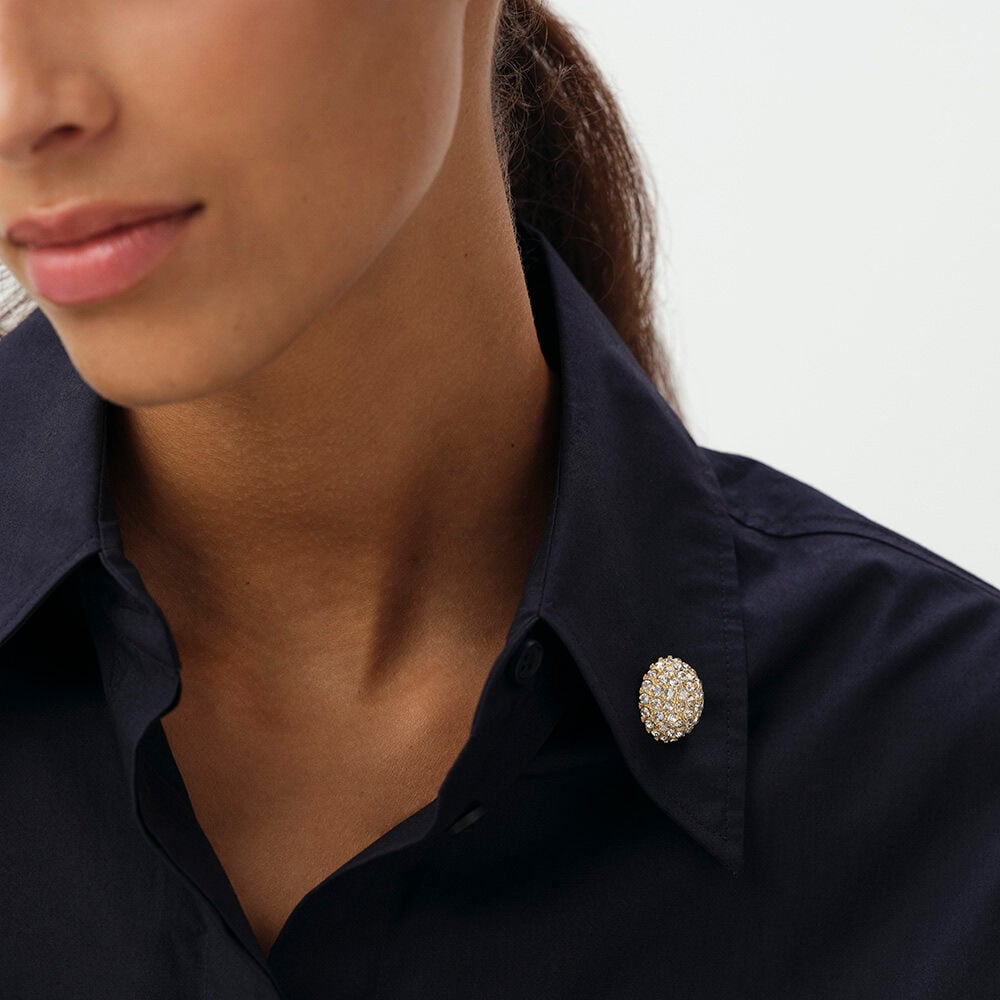 Broche acabado en oro con circonitas en color cristal. Los broches han venido para quedarse, aportan un toque definitivo a todo lo que te pongas. El complemento perfecto para no pasar desapercibida.