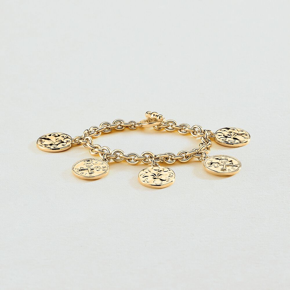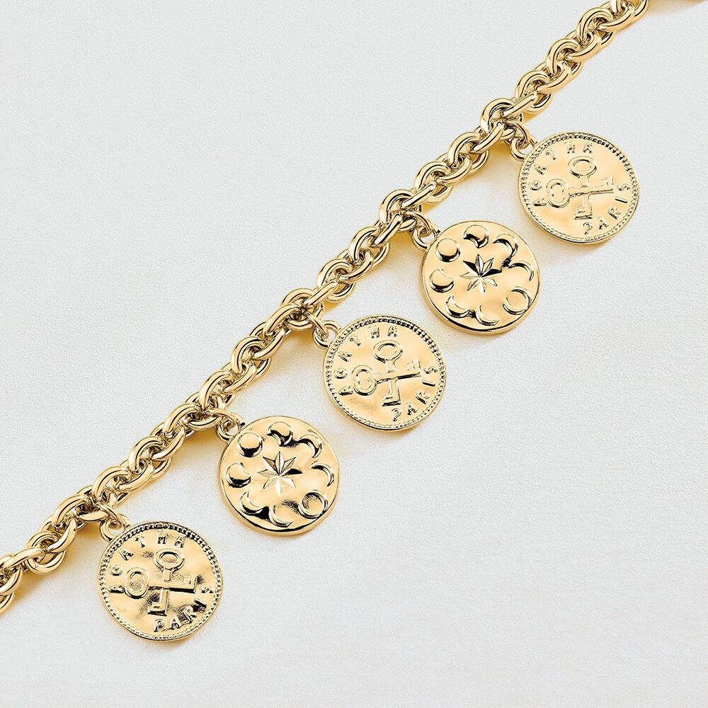 Pulsera acabada en oro con colgantes en forma de medallas grabadas. Volvemos a nuestros orígenes y revisitamos nuestras joyas más míticas, hazte con esta pulsera y capta todas las miradas. Cumplimos 50 años y queremos celebrarlo contigo.Fabricado en nuestros talleres parisinos, cada pieza de la colección St Honoré está meticulosamente diseñada, esculpida a mano, dorada mediante un proceso tradicional y luego ensamblada a mano para garantizar una calidad y durabilidad excepcionales. Una joya única que lleva consigo el legado y la elegancia atemporal de Agatha..