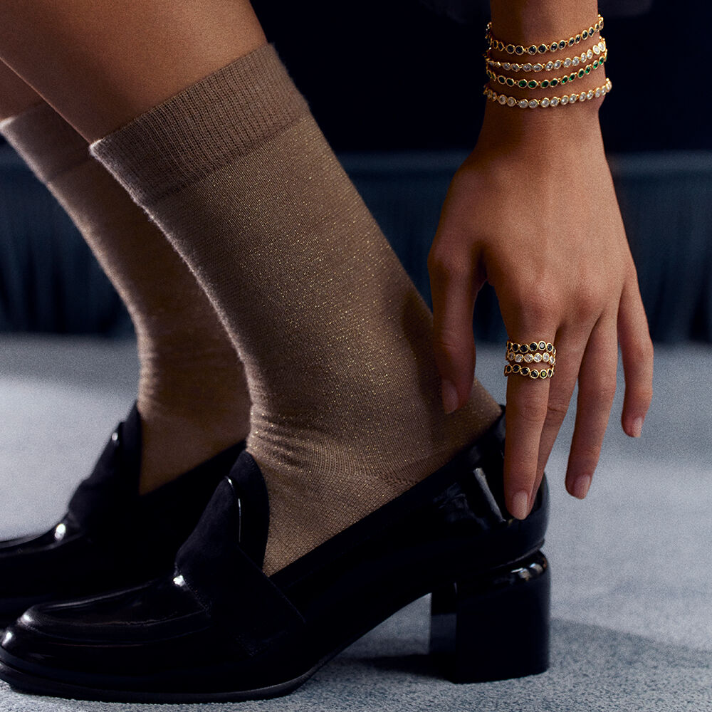 Pulsera acabada en oro con circonitas tipo Rivière en color blanco, gris o verde. Una pulsera muy festiva pero que también dará el twist definitivo a tus looks más básicos.