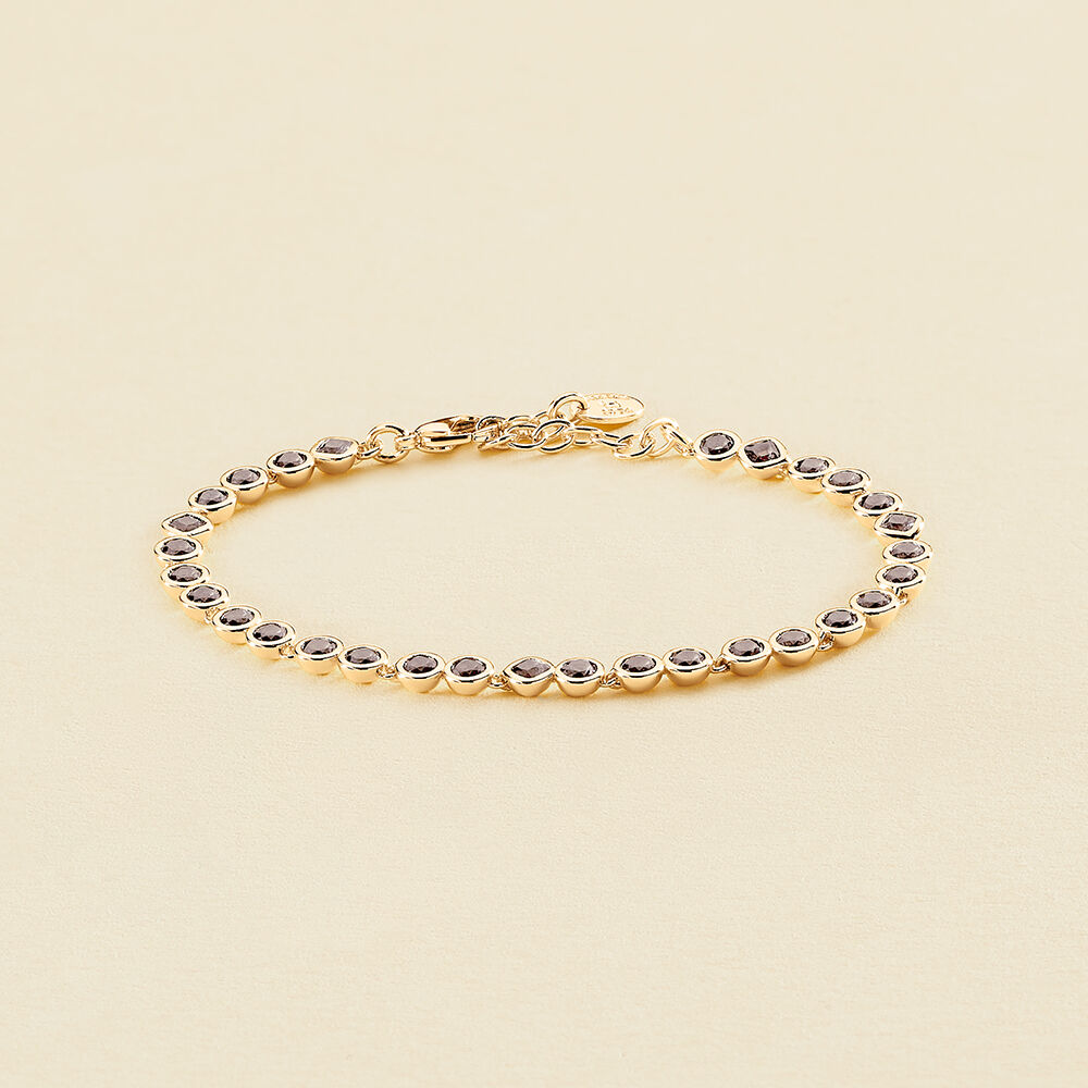 Pulsera acabada en oro con circonitas tipo Rivière en color blanco, gris o verde. Una pulsera muy festiva pero que también dará el twist definitivo a tus looks más básicos.