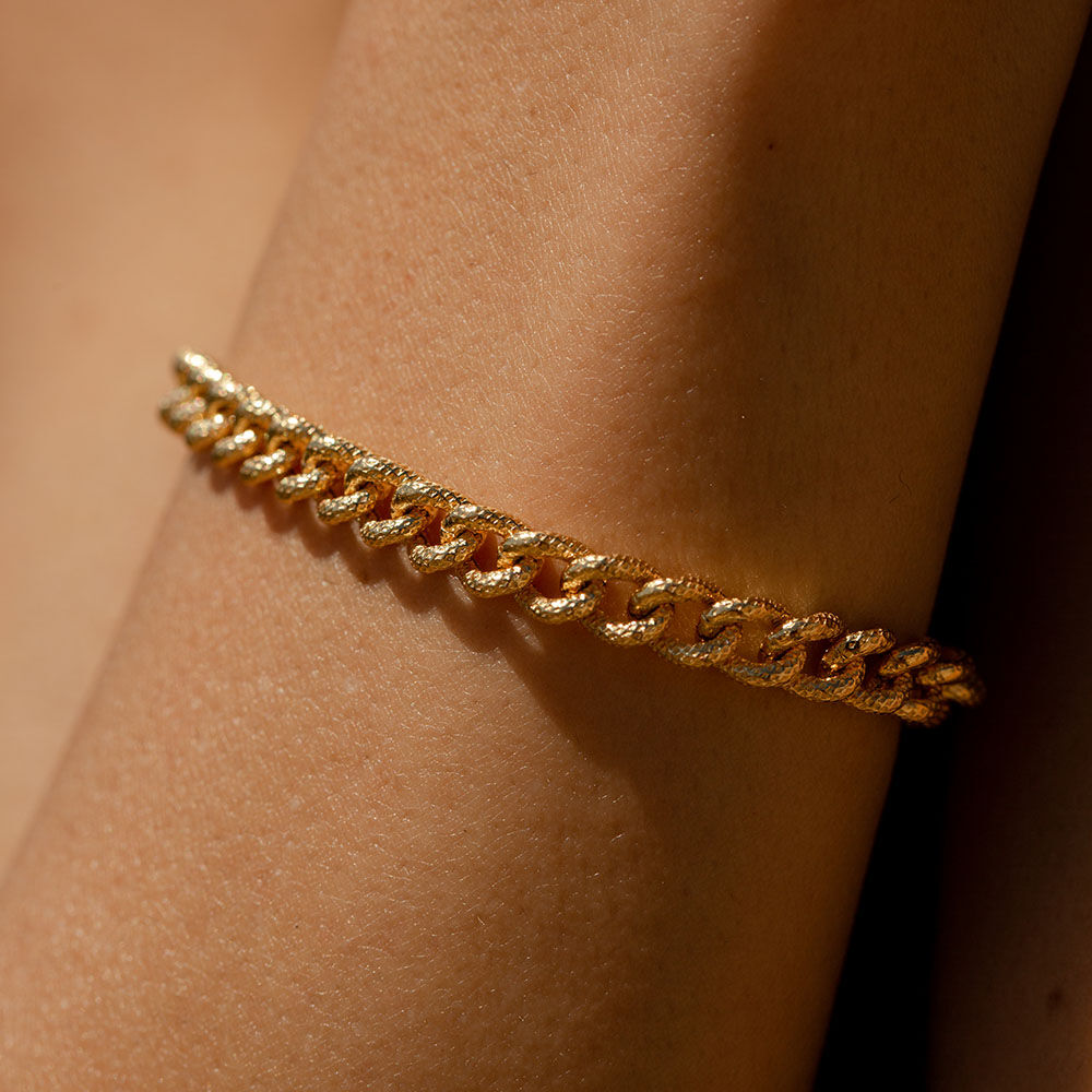 Pulsera de eslabones ovalados texturizados de plata de ley con baño de oro. Una joya ideal para regalar y auto regalarse porque va con todo. La puedes llevar sola o lucirla con tus pulseras favoritas, un acierto total..