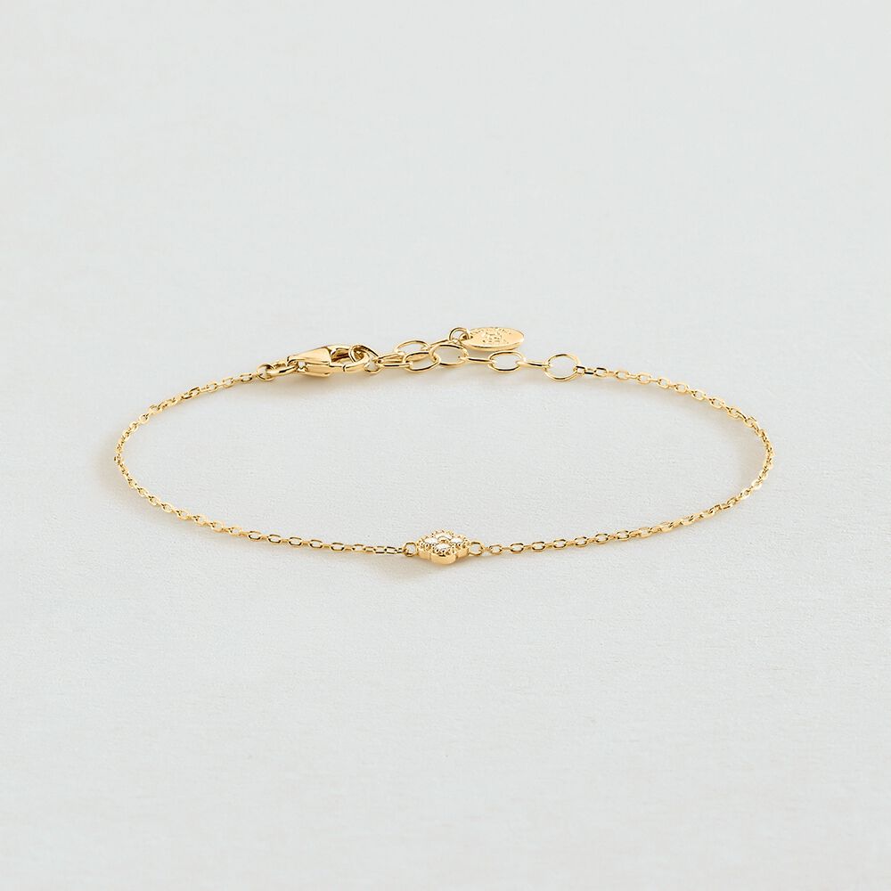 Pulsera de plata de ley con baño de oro y una flor de circonita en el centro. Una joya intemporal para lucir toda la temporada y dar el toque ideal de luz y brillo. Beloved es una colección perfecta para regalar y auto regalarse. Esta joya mide 150mm y tiene un alargo de 30mm