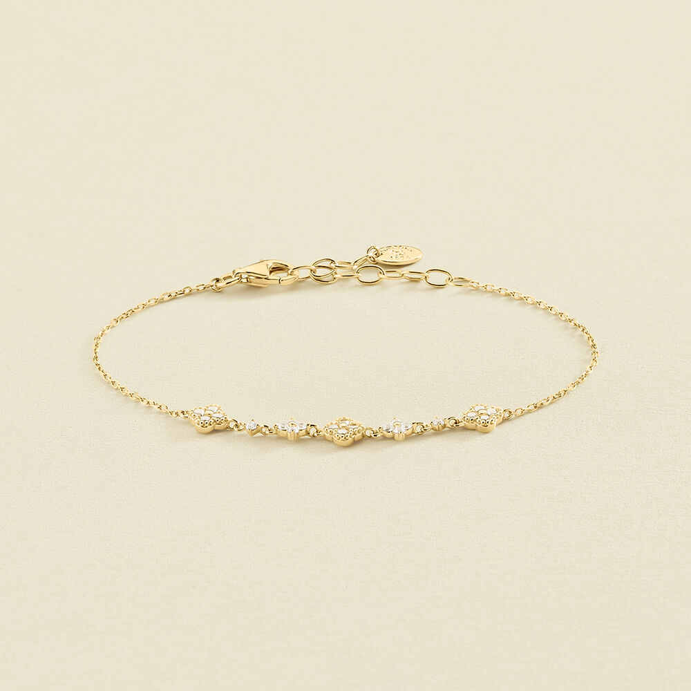 Pulsera de plata de ley con baño de oro y tira de circonitas de diferentes formas. Una joya intemporal para lucir toda la temporada y dar el toque ideal de luz y brillo. Beloved es una colección perfecta para regalar y auto regalarse. Esta joya mide 150 mm con un alargo extra de 30 mm