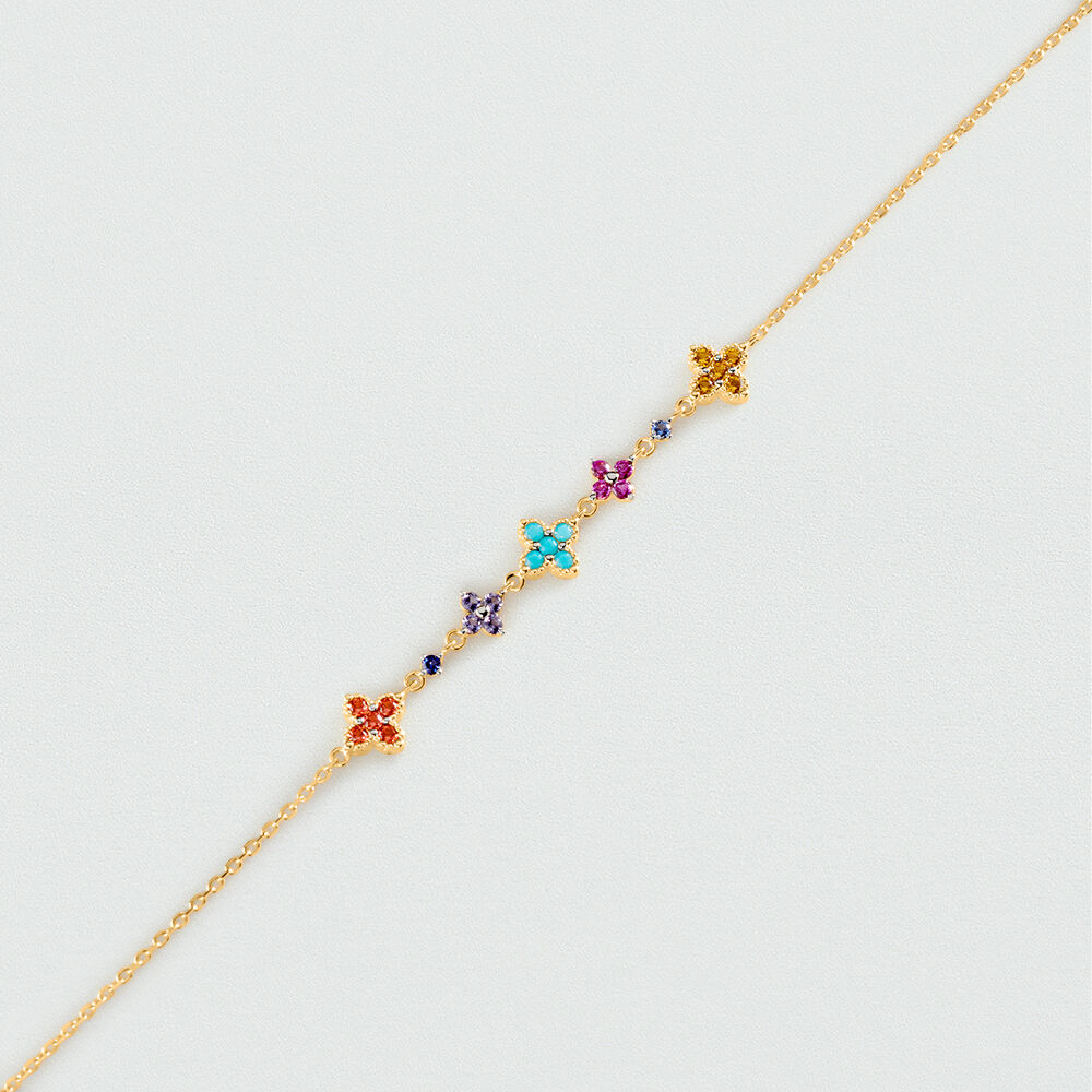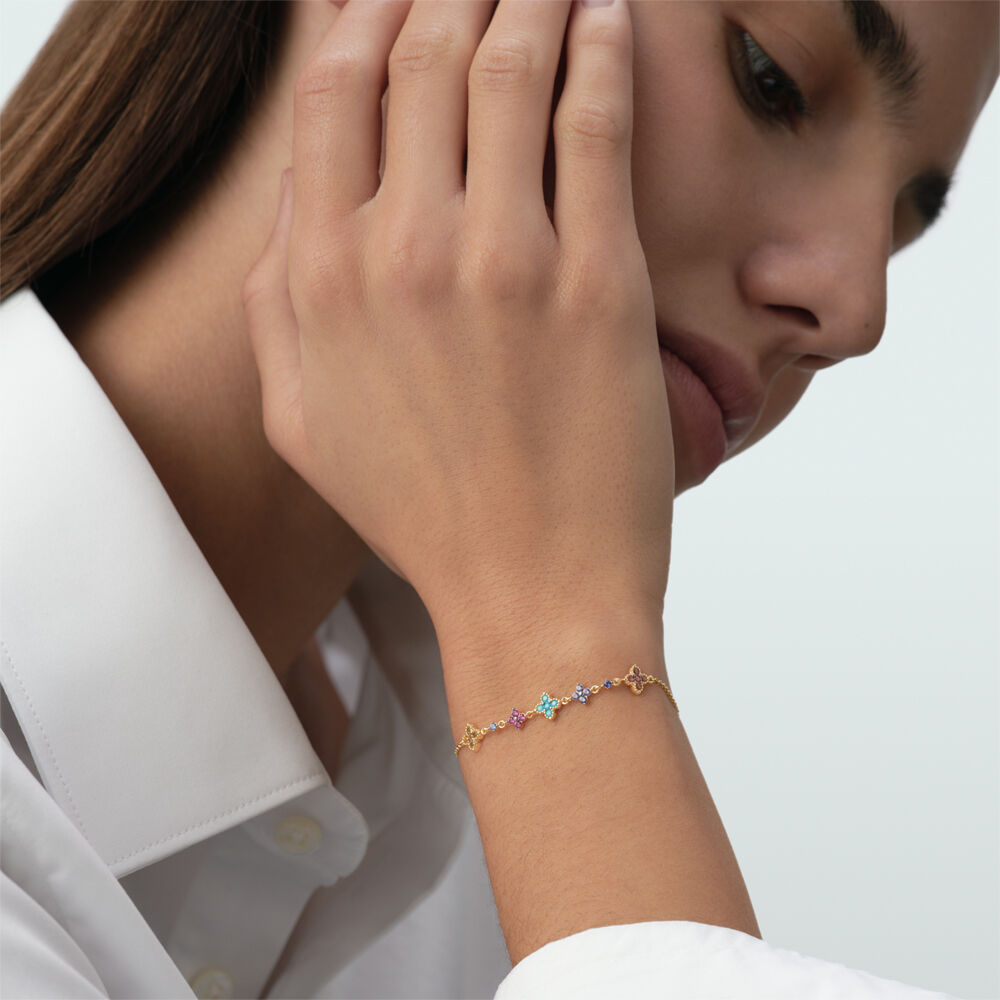 Pulsera de plata de ley con baño de oro y tira de circonitas multicolores formando mini flores. Una joya intemporal para lucir toda la temporada y dar el toque ideal de luz y brillo. Beloved es una colección perfecta para regalar y auto regalarse. Esta joya mide 150 mm con un alargo extra de 30 mm
