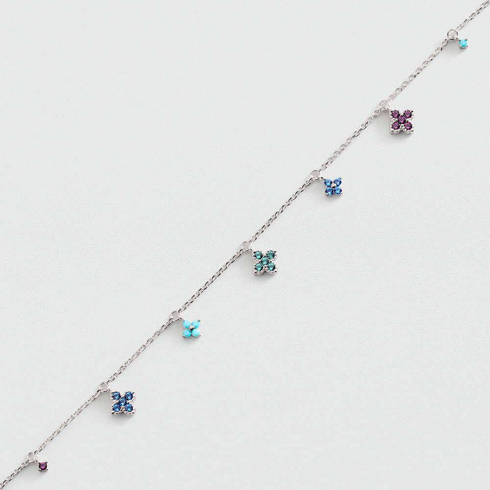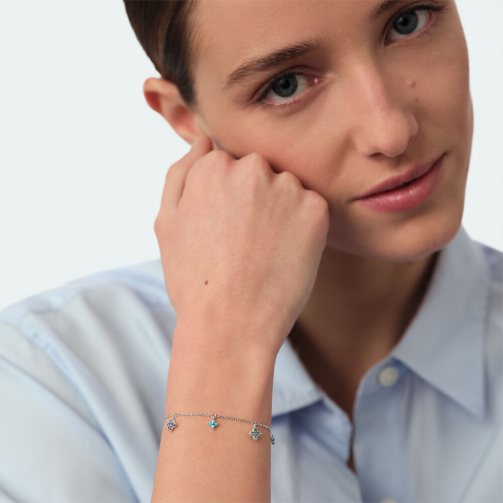 Pulsera de cadena de plata de ley y mini colgantes con circonitas en forma de flor. Llevable, combinable y tendencia, ¡el mix perfecto! Solo te queda decidir si prefieres la versión más neutra con circonitas blancas o el push de color definitivo para todos tus looks con las circonitas en tonos azules. Esta joya mide 150 mm con un alargo extra de 30 mm