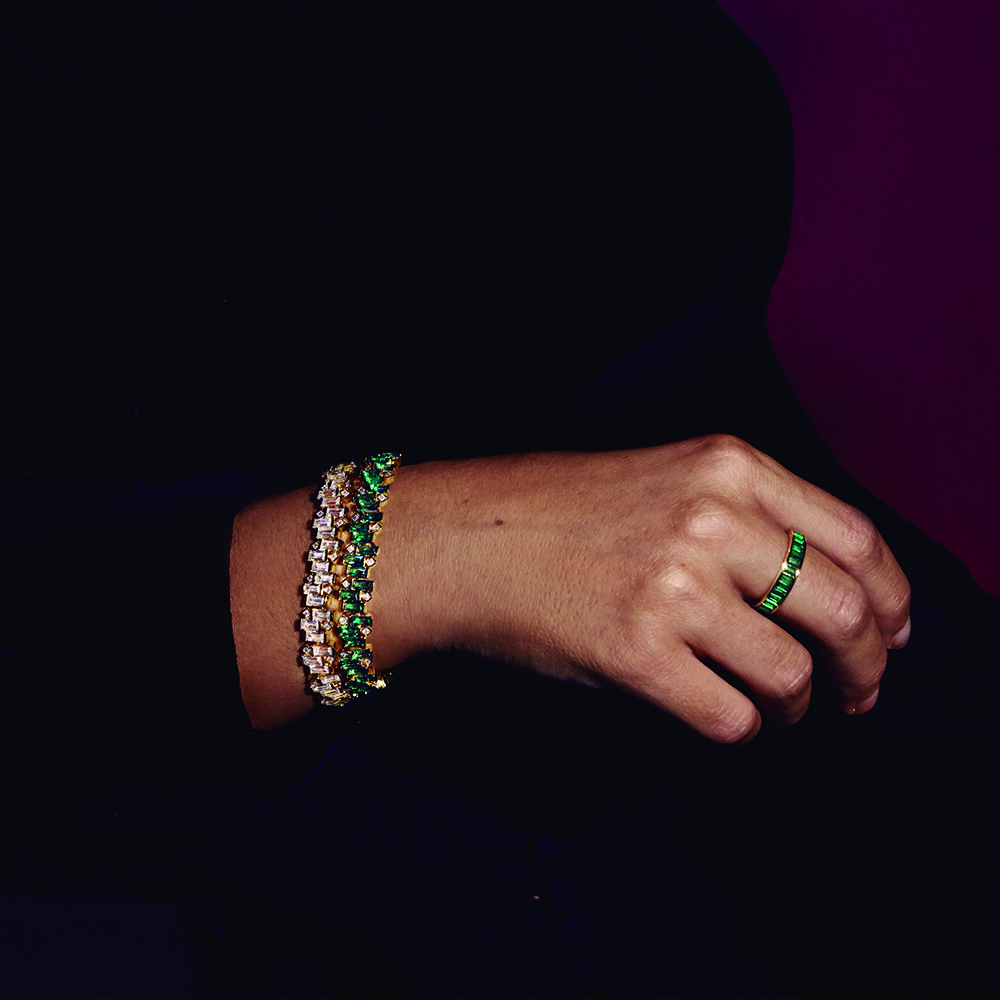 Pulsera bañada en oro con circonitas blancas en talla baguette, acabada con circonitas blancas, rosa vintage y verde esmeralda engastadas en forma de rombo. Una joya para tus ocasiones más especiales, no necesitarás llevar nada más. Su excepcional diseño la convierte en la pulsera ideal para tus outfits más chic y es muy cómoda de llevar. Déjate seducir por los nuevos diseños de Maria Pombo X Agatha y no dejes indiferente a nadie.