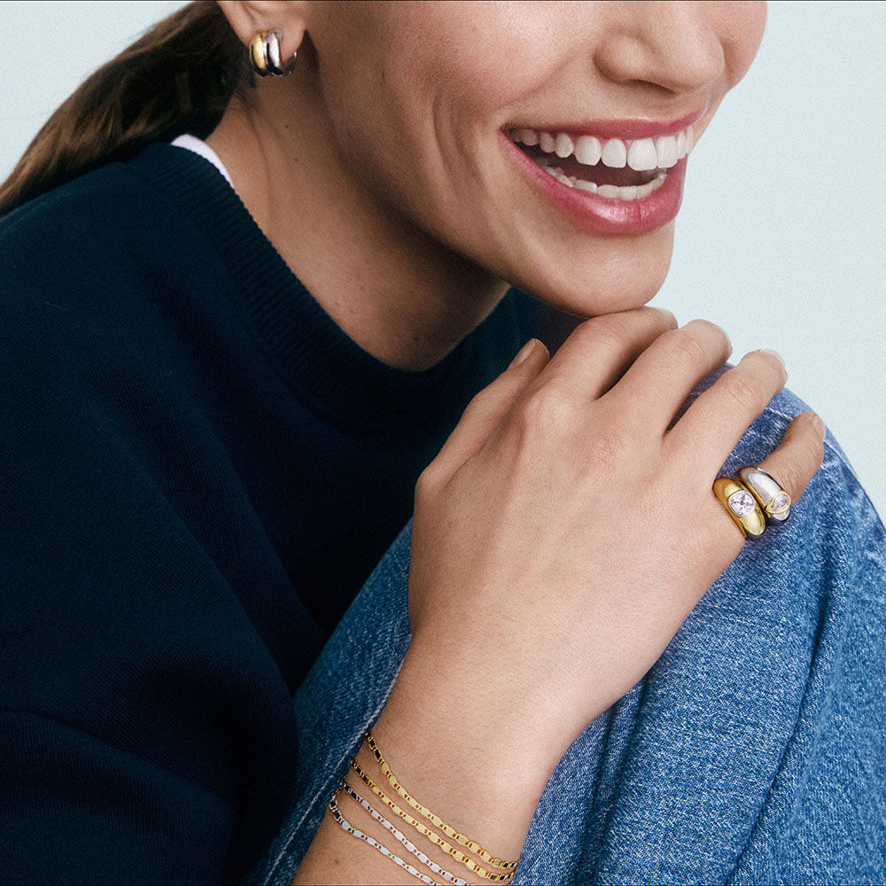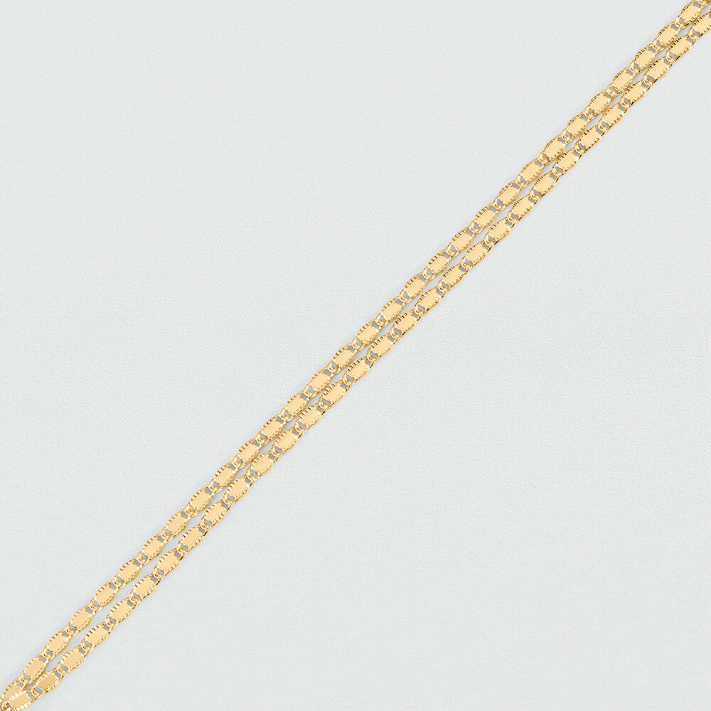 Pulsera doble acabada en oro. Ideal para el día a día y fascinante cuando la combinas con su collar a conjunto. El detalle perfecto para regalar… o para darte un capricho. Esta joya mide 150 mm con un alargo extra de 30 mm
