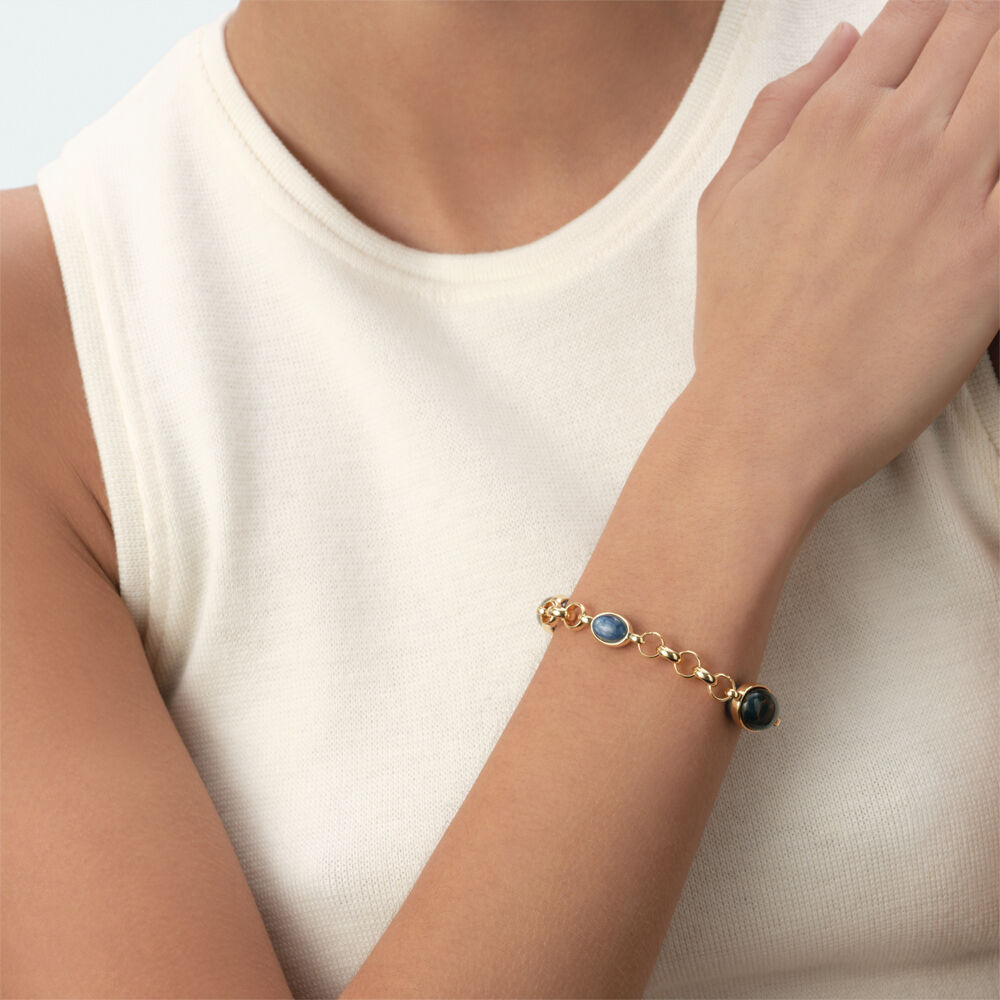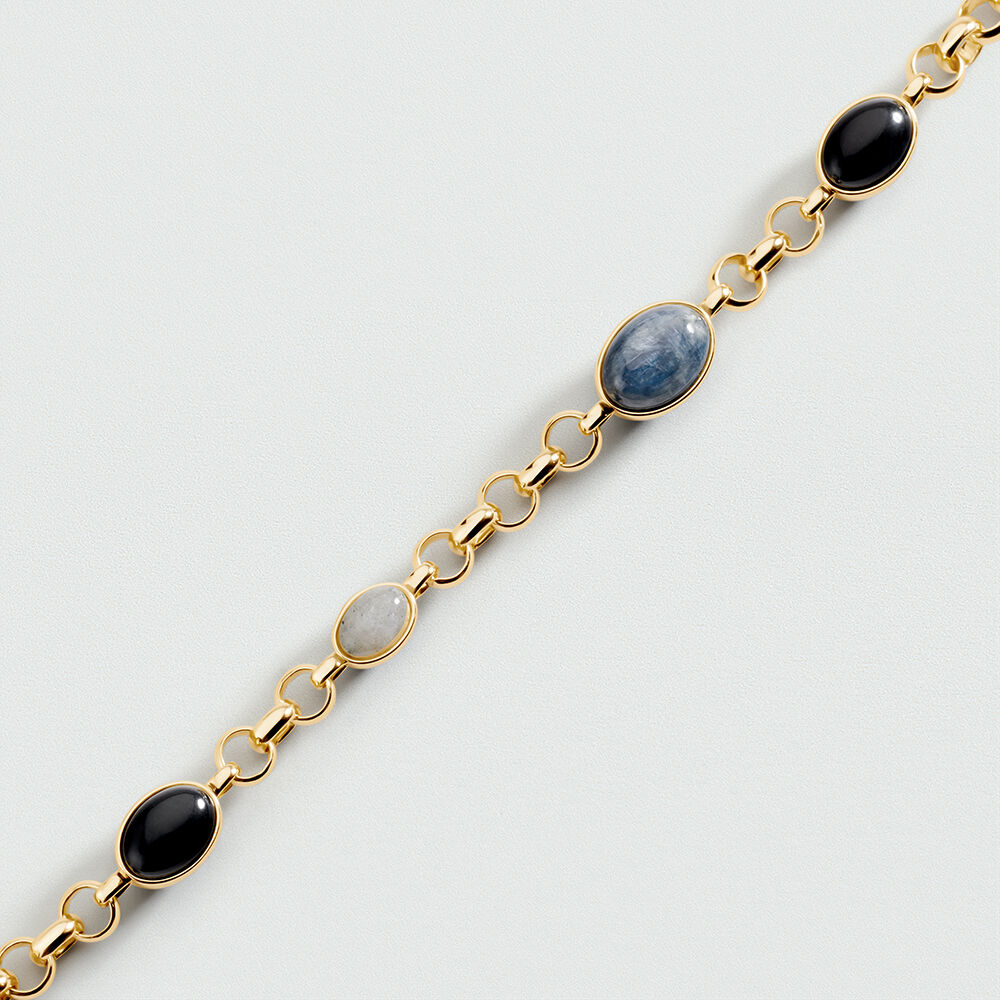 Pulsera de cadena de eslabones combinada con piedras naturales en tonalidades azuladas. Una pieza especial que convierte cualquier momento en algo memorable, perfecta para regalar o para darte ese capricho que tanto mereces. Está compuesta por tres piedras naturales: cianita, labradorita y ojo de tigre.