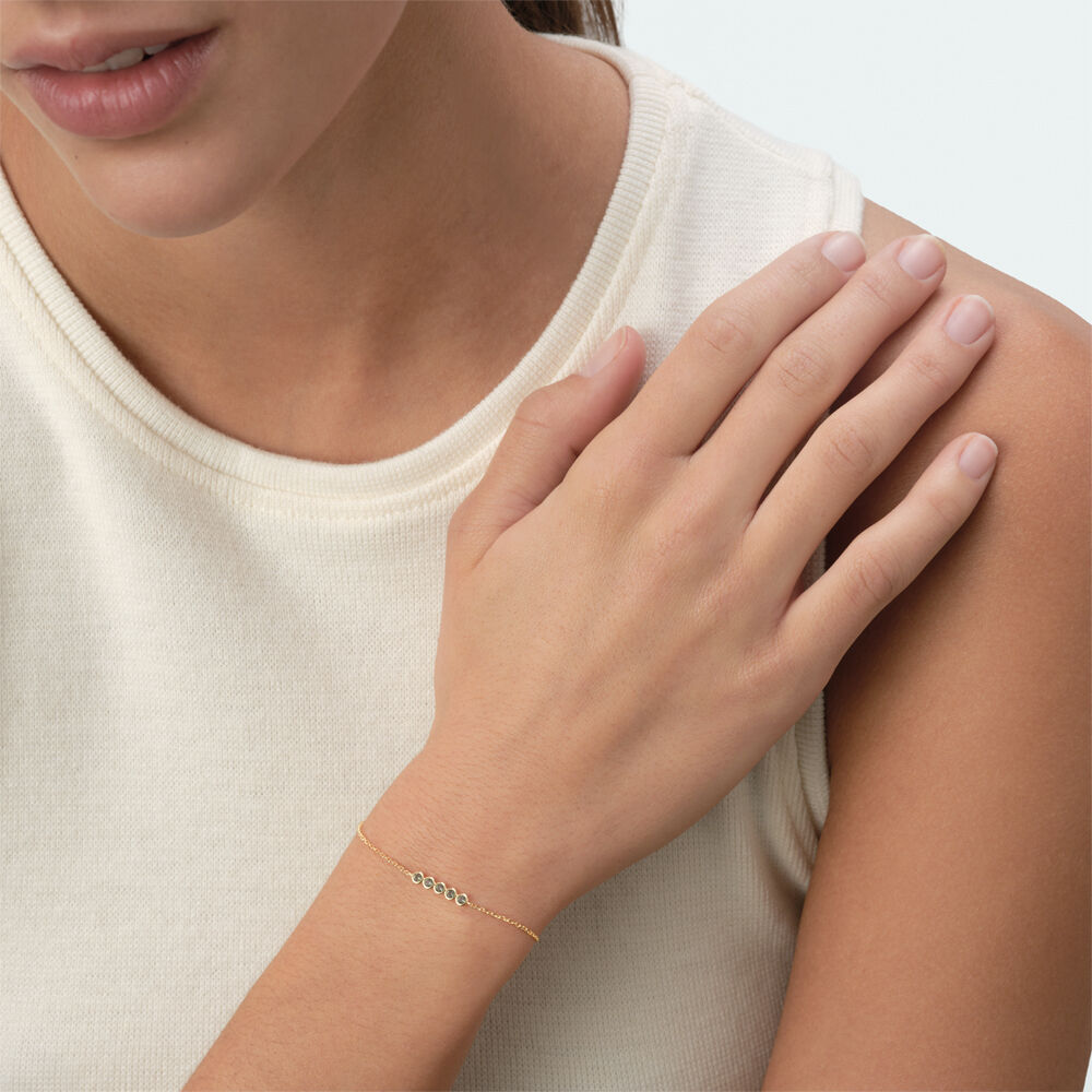 Pulsera de plata de ley y baño de oro con circonitas redondas, tú decides si las quieres en color cristal o verde. Un verdadero fondo de joyero para adornar tus muñecas con un toque muy sofisticado, aporta un montón de luz. Esta joya mide 150 mm con un alargo extra de 30 mm