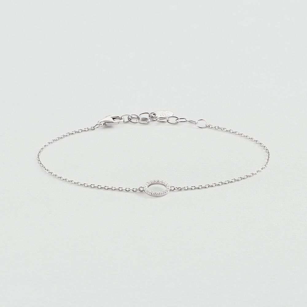 Pulsera de plata de ley con baño de rodio y colgante en forma de aro con circonitas. Una apuesta perfecta para el día a día, ideal para regalar y auto regalarte, acertarás siempre. Esta joya mide 150mm y tiene un alargo de 30mm
