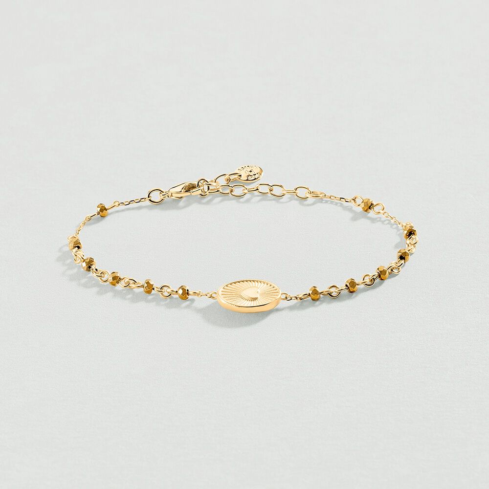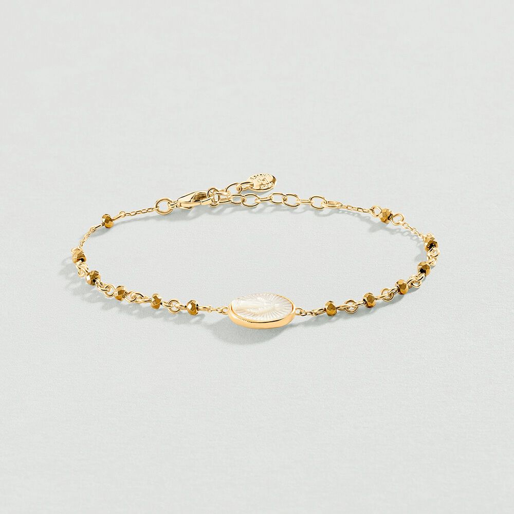 Pulsera, tipo rosario, acabada en oro. Tiene una medalla de nácar con la Virgen en el centro. Todas las piedrecitas son piritas. Este modelo existe en 3 colores que recuerdan a los tonos del atardecer: multicolor por todos los tonos en los que puede reflejar el sol, el dorado que baña tu piel con sus últimos destellos y el verde del mar que parece infinito. Luce verano a todas horas con esta joya que no te querrás quitar. Sunset is a New Addiction, no te quedes sin tus joyas favoritas de María Pombo X Agatha Paris.Esta joya no se puede mojar.