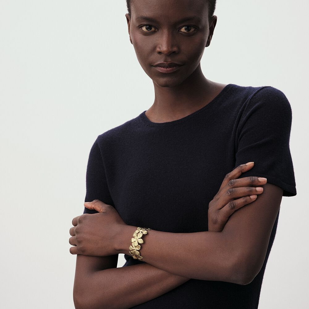 Pulsera rígida acabada en oro de 18k con flores. El volumen y la textura de las flores la convierten en una pieza realmente especial y bonita. Lúcela a todas horas, redondea cualquier look y aporta el twist romántico que tanto nos apetece..