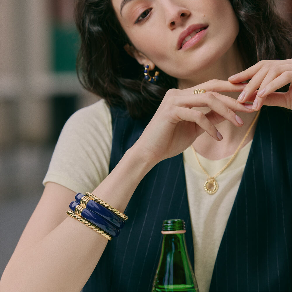 Pulsera rígida y articulada de acetato y acabada en oro. La tienes en varios tonos para elegir. Una apuesta de lo más favorecedora para esta temporada. Son ideales para llevar en tu día a día y dar un toque perfecto de color a tus looks.