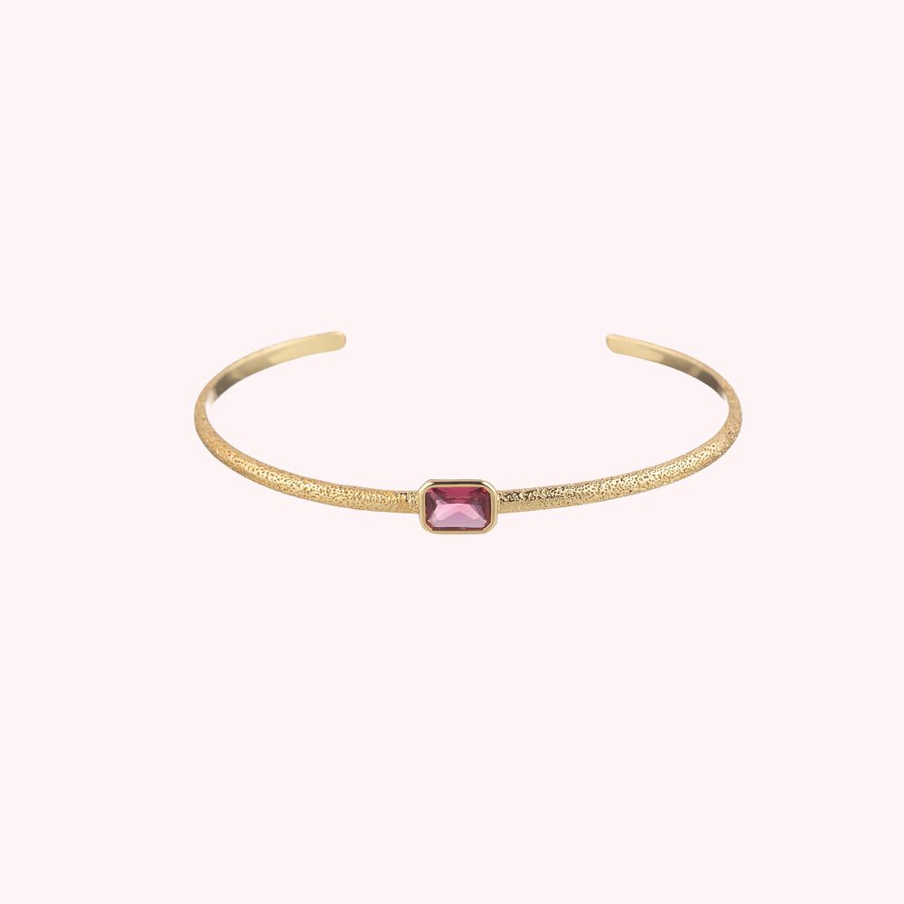 Pulsera rígida acabada en oro de 18k con circonita verde o rosa en talla esmeralda. Una pulsera ideal para llevar sola pero también perfecta para combinar y acumular y conseguir un efecto wow inmediato. Potencia la diosa que llevas dentro con lo nuevo de Maria Pombo X Agatha Paris..