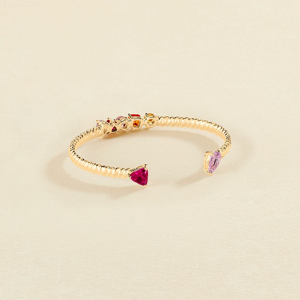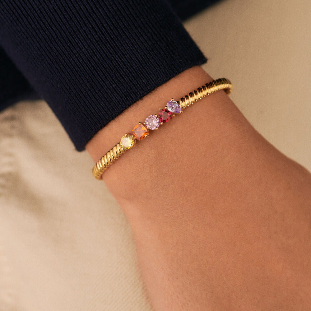 Pulsera rígida y abierta acabada en oro con circonitas de diferentes formas y colores. Una pulsera que atrapará todas las miradas y aportará luz y color a tus outfits. ¡No te quedes sin ella!.