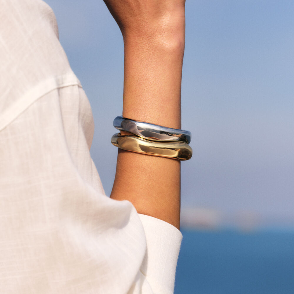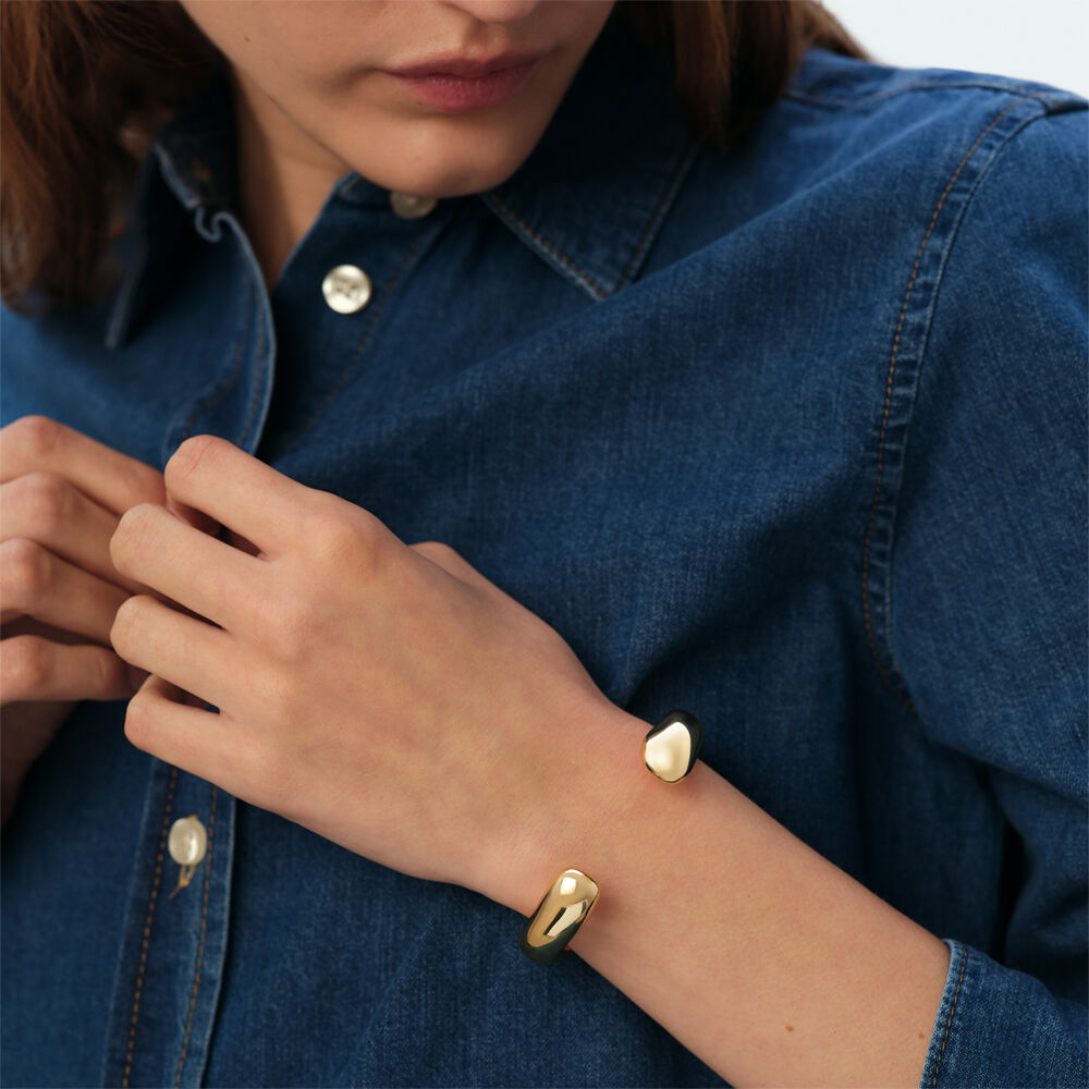 Pulsera rígida e irregular de latón con baño de oro. Es perfecta tanto para llevar sola como para combinar con el resto de pulseras de tu joyero..