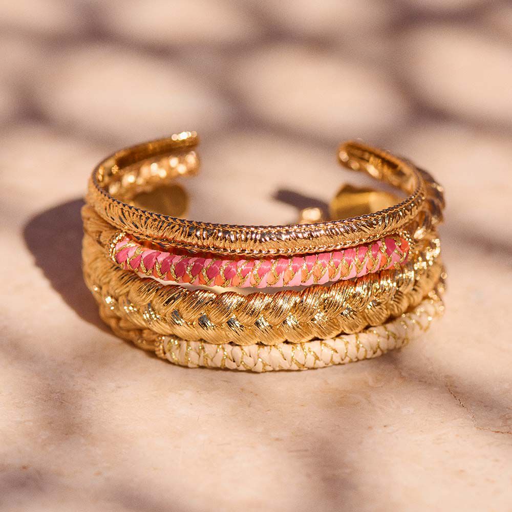 Pulsera rígida y abierta acabada en oro con rafia de colores. Una propuesta ideal para el verano, estilosa y que combina con todo, aportando un toque de color muy especial.