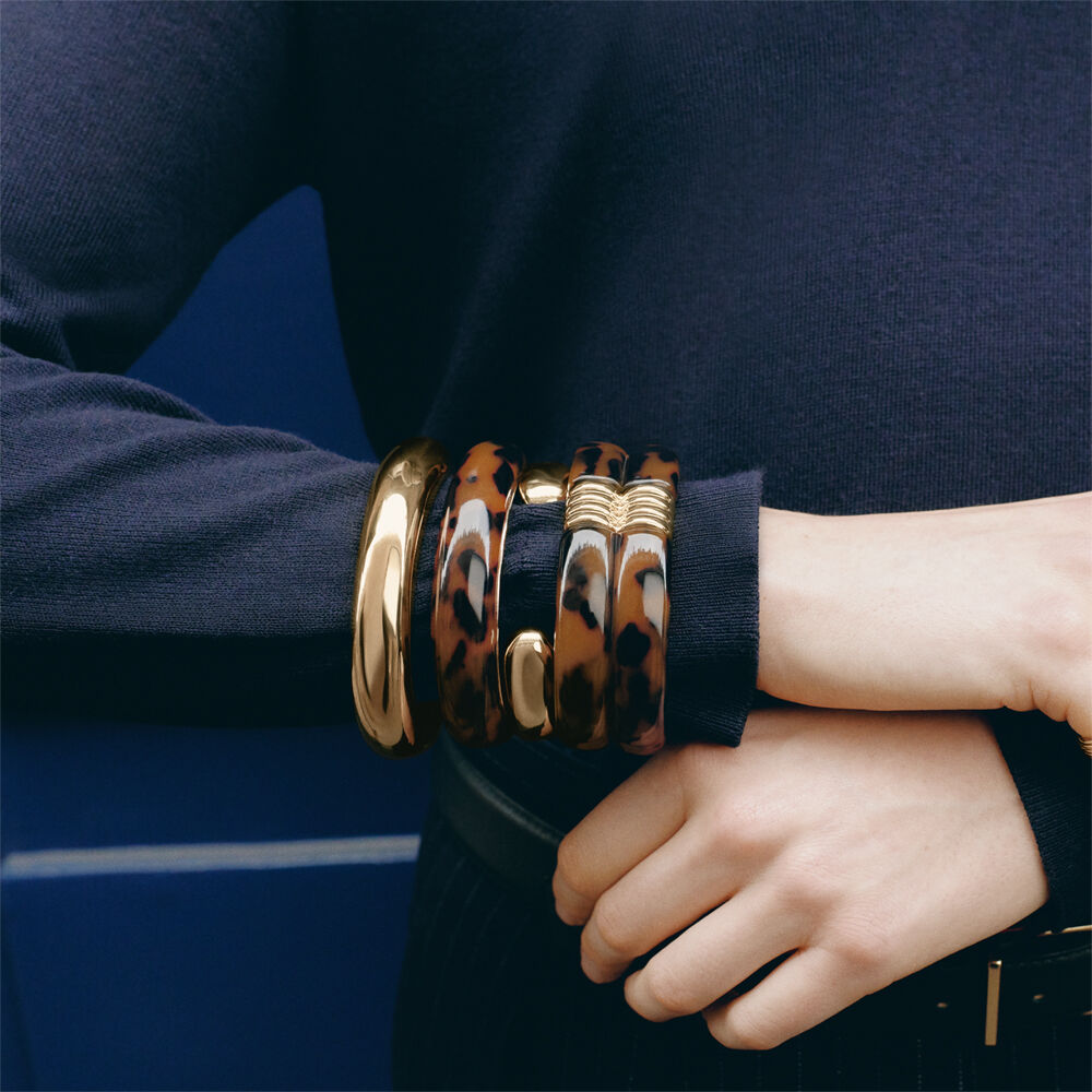 Pulsera rígida y abierta de resina acabada en oro. Este diseño es ideal para combinar con alguna otra pulsera rígida dorada y crear un total look de infarto.